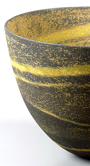 She has explained: “I colour my pots by the addition of oxides, body stains, and underglazes to the clay slip rather than by application of color to the surface.... This gives an even color through the pot and a complete fusion of the clay body and stain. I am specifically interested in the migration of oxides and the interaction of color.” Perhaps it is incidental, but when she trained at Edinburgh College of Art, Lee did tapestry as well as ceramics. Perhaps from working with cloth she found a parallel between warps and wefts and interwoven colors, and coiled potmaking.